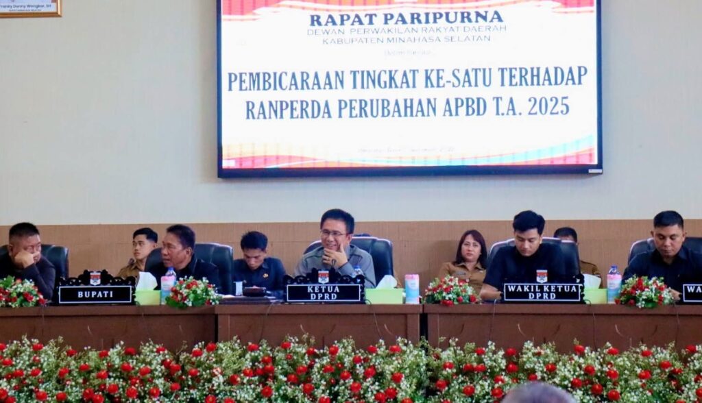 MINSEL, Inspirasisulut.com – Ketua DPRD Kabupaten Minahasa Selatan, Stevanus D. N. Lumowa, SE, memimpin langsung Rapat Paripurna DPRD dengan agenda Pembicaraan Tingkat Satu terhadap Rancangan Peraturan Daerah (Ranperda) tentang Perubahan APBD Tahun Anggaran 2025, Senin (1/9/2025).