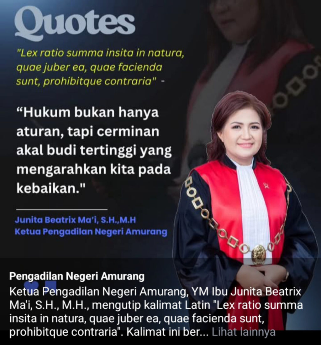 Amurang, 24 September 2025 — Dalam sebuah pernyataan yang sarat makna dan refleksi mendalam, Ketua Pengadilan Negeri Amurang, YM Ibu Junita Beatrix Ma’i, S.H., M.H., mengutip sebuah kalimat Latin klasik yang menggugah pemikiran: “Lex ratio summa insita in natura, quae jubet ea, quae facienda sunt, prohibitque contraria.”